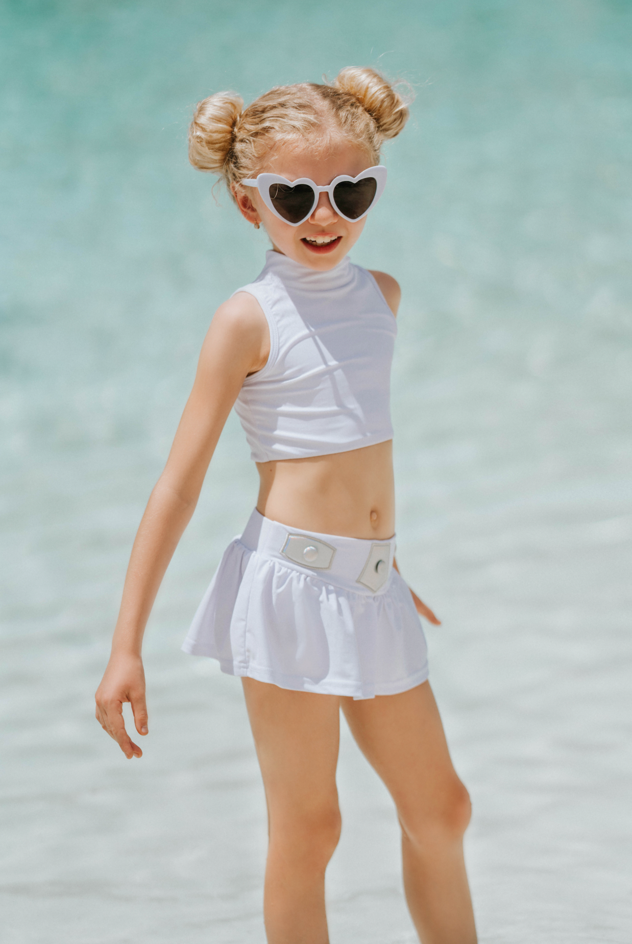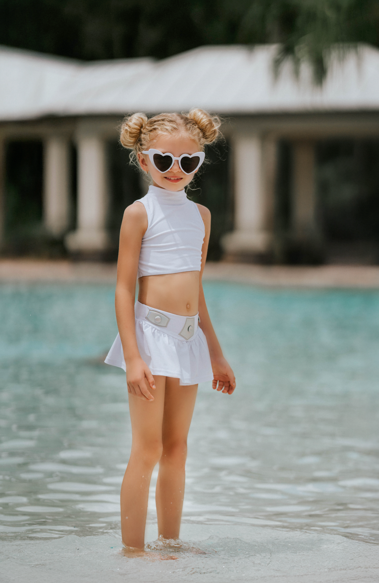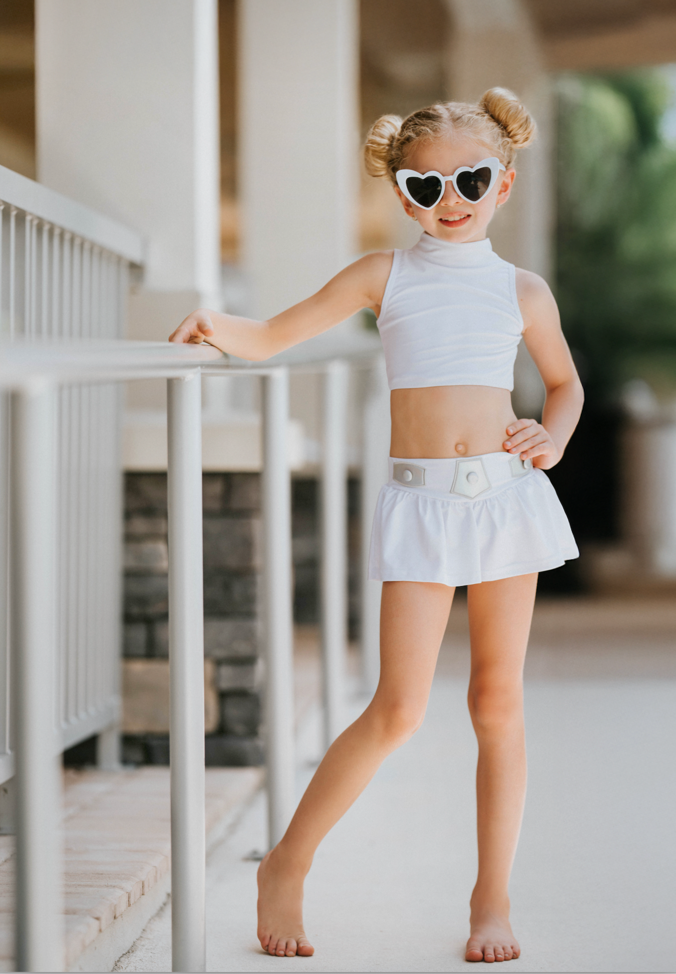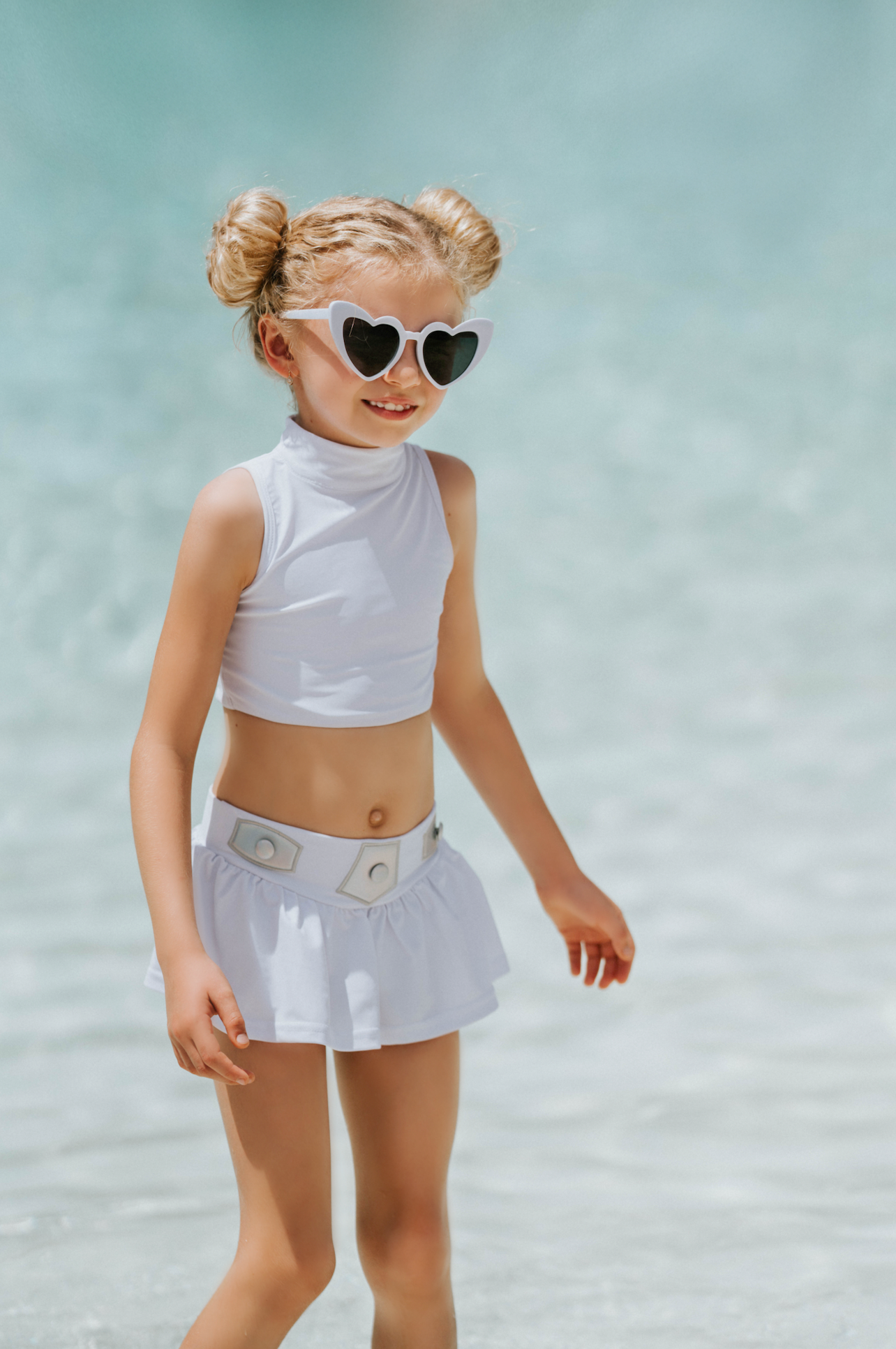 Let your little one make a splash in galactic style with our Space Princess Swim Set! Inspired by interstellar royalty, this two-piece swimsuit features a sleek high-neck crop top and a flouncy mini skirt bottom with futuristic button accents. The soft, stretchy fabric ensures all-day comfort and play-ready movement, whether at the beach, pool, or backyard. Perfect for bold, imaginative adventurers, this swim set is ideal for little fashionistas who dream of galaxies far, far away.