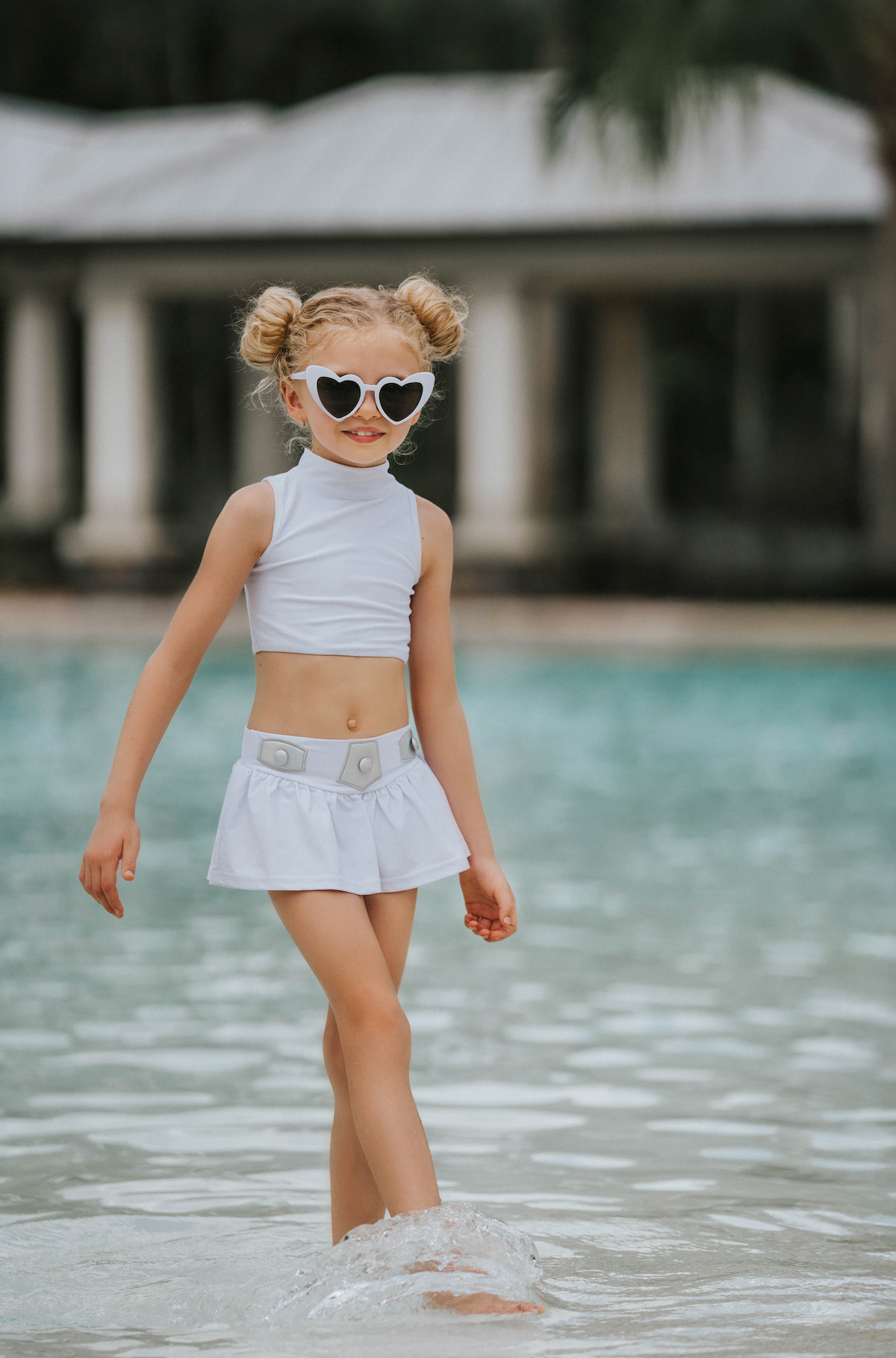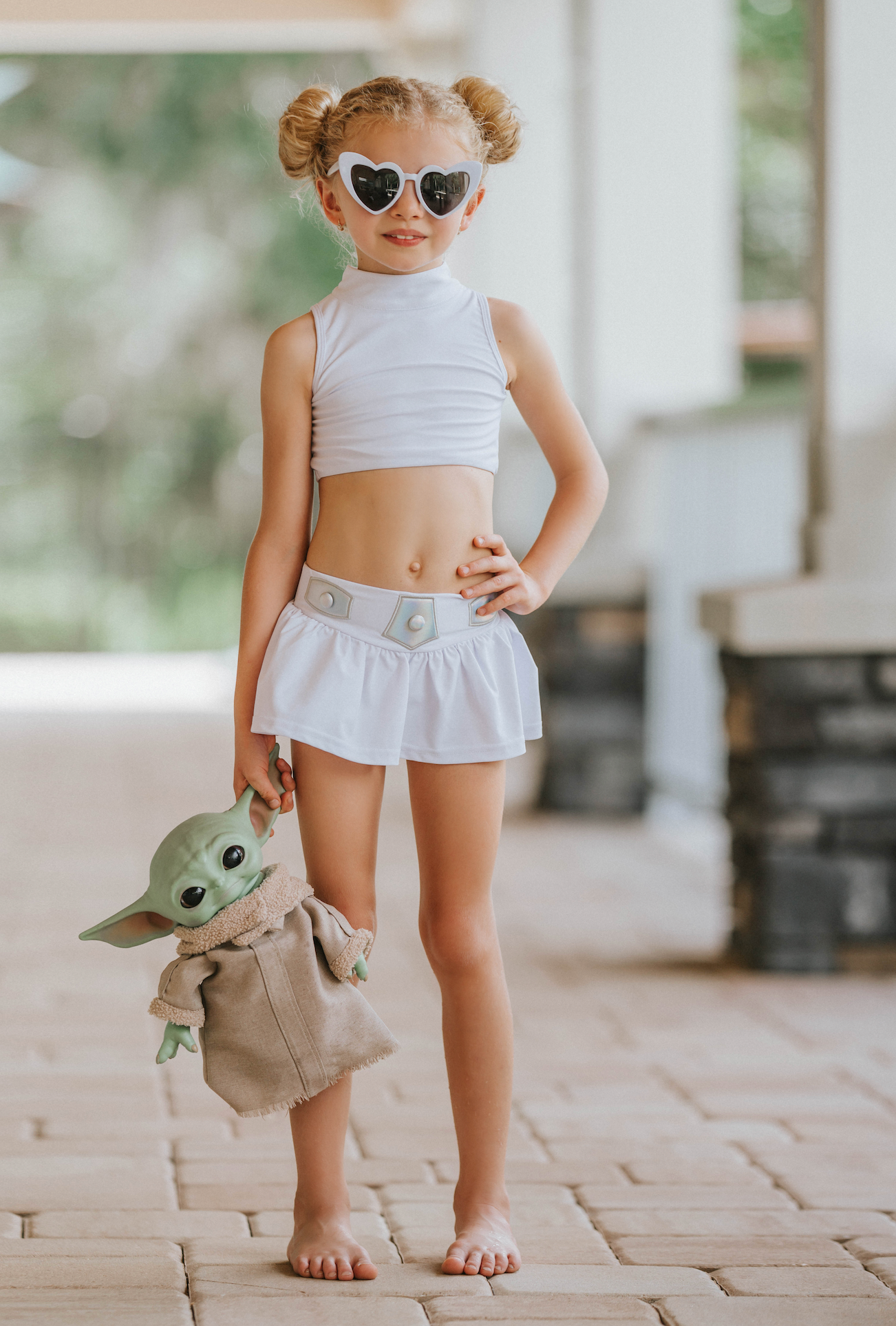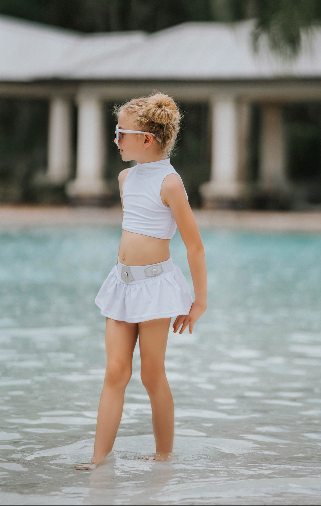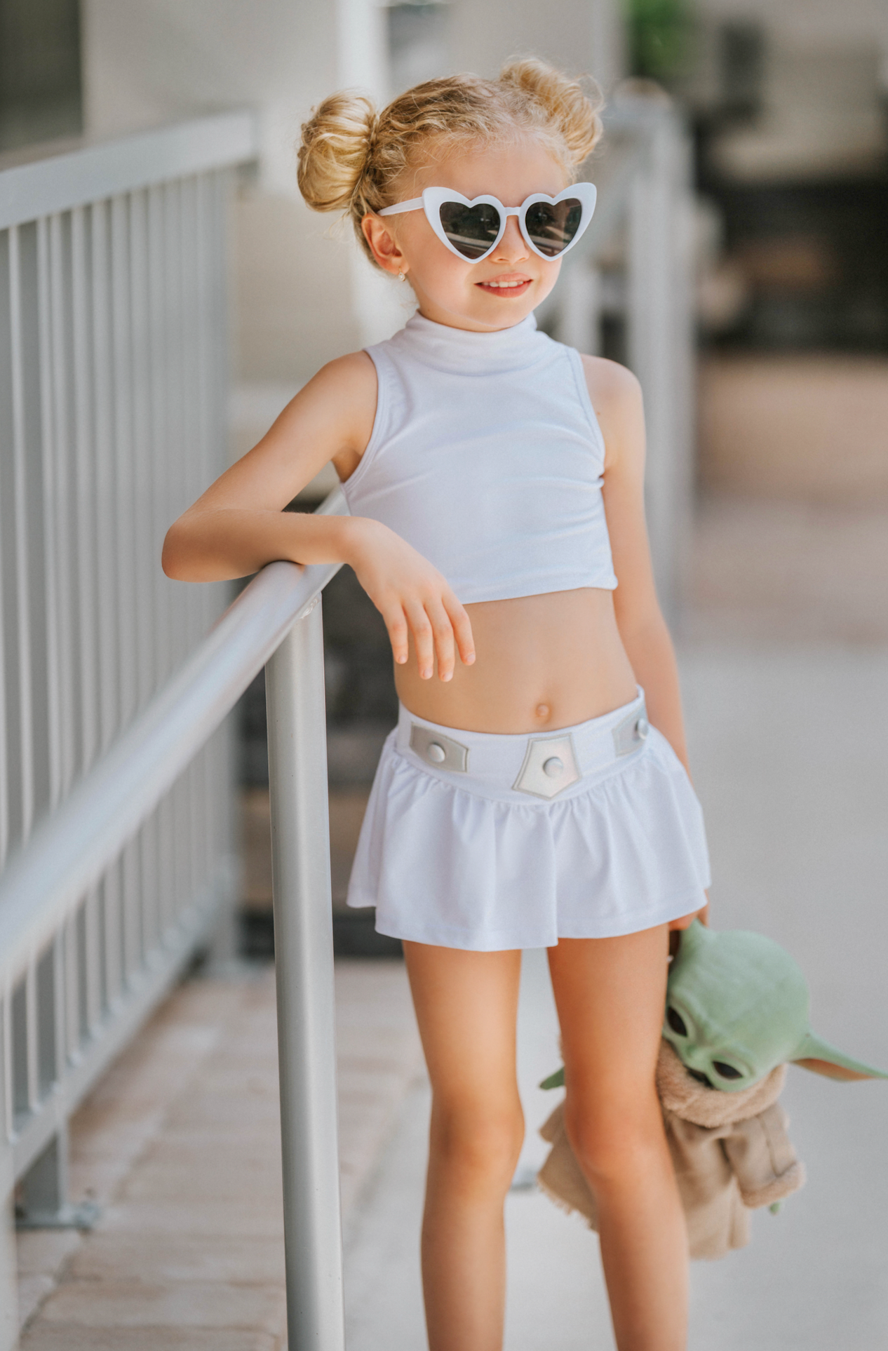 Let your little one make a splash in galactic style with our Space Princess Swim Set! Inspired by interstellar royalty, this two-piece swimsuit features a sleek high-neck crop top and a flouncy mini skirt bottom with futuristic button accents. The soft, stretchy fabric ensures all-day comfort and play-ready movement, whether at the beach, pool, or backyard. Perfect for bold, imaginative adventurers, this swim set is ideal for little fashionistas who dream of galaxies far, far away.