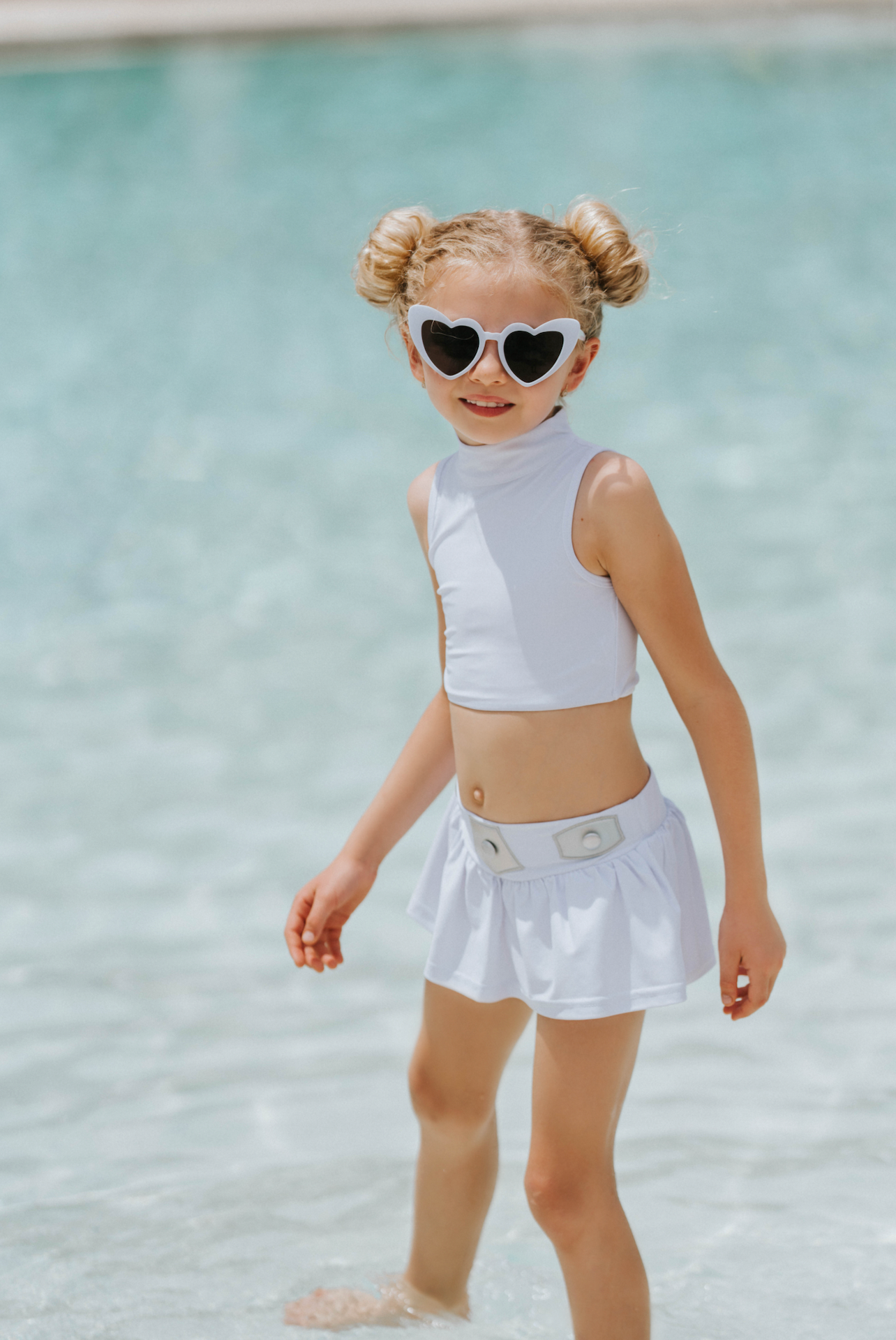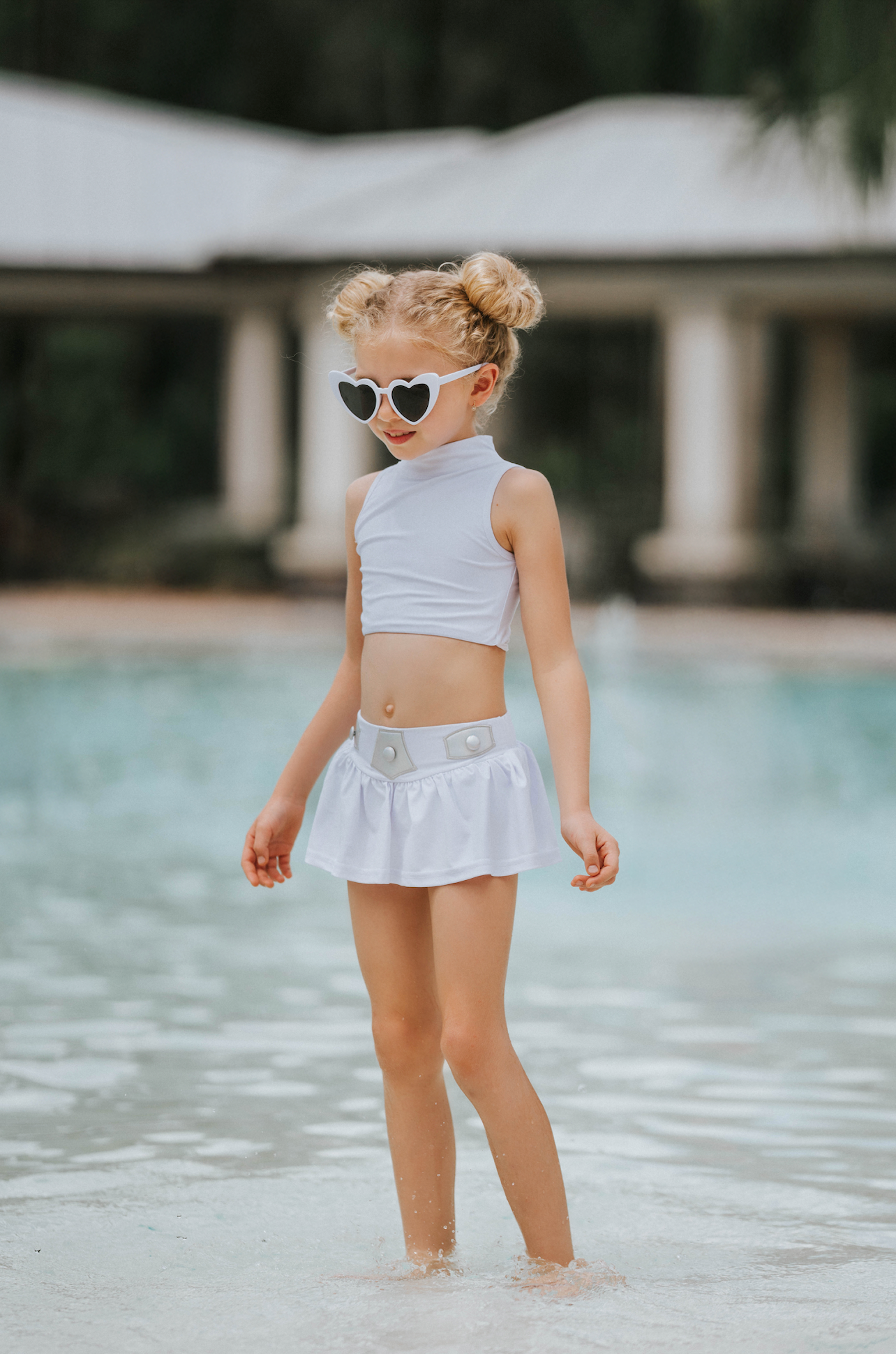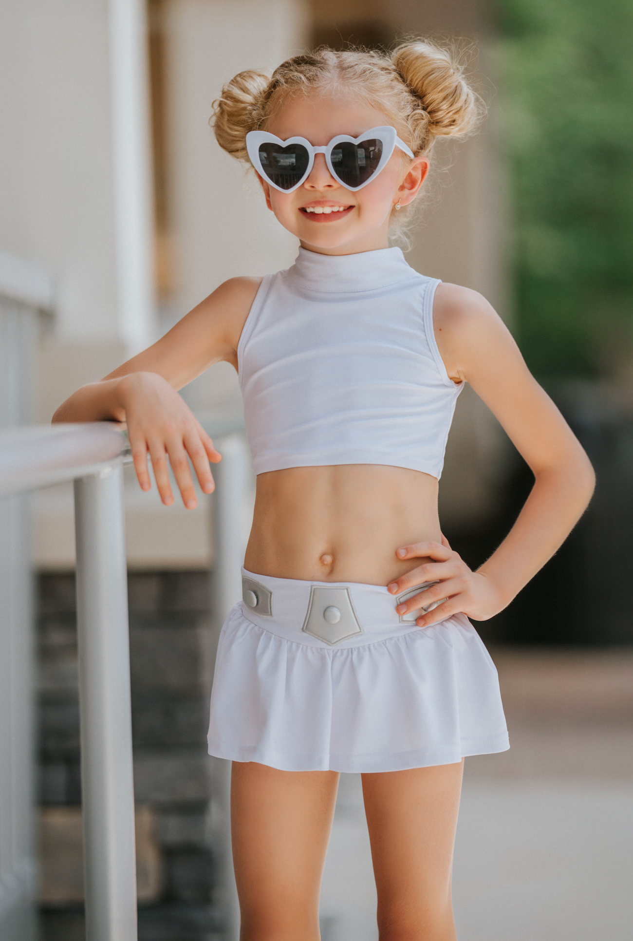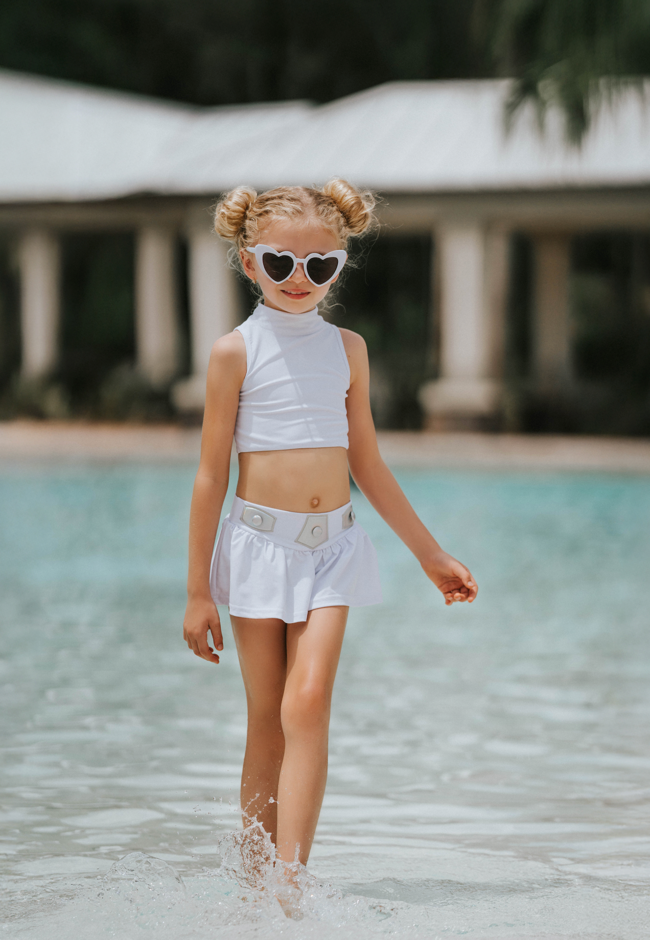 Let your little one make a splash in galactic style with our Space Princess Swim Set! Inspired by interstellar royalty, this two-piece swimsuit features a sleek high-neck crop top and a flouncy mini skirt bottom with futuristic button accents. The soft, stretchy fabric ensures all-day comfort and play-ready movement, whether at the beach, pool, or backyard. Perfect for bold, imaginative adventurers, this swim set is ideal for little fashionistas who dream of galaxies far, far away.