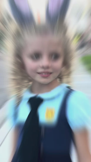 This adorable Bunny Police Officer Twirl Dress is perfect for little Zoo Movie loving fans with big dreams! Designed to look like the bunny officers iconic uniform, this outfit features a soft blue puff-sleeve top, faux vest bodice with gold star badge patch, pleated navy skirt with stripe trim, and a sewn-in black tie.