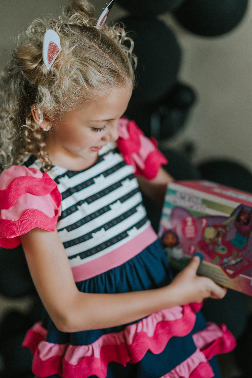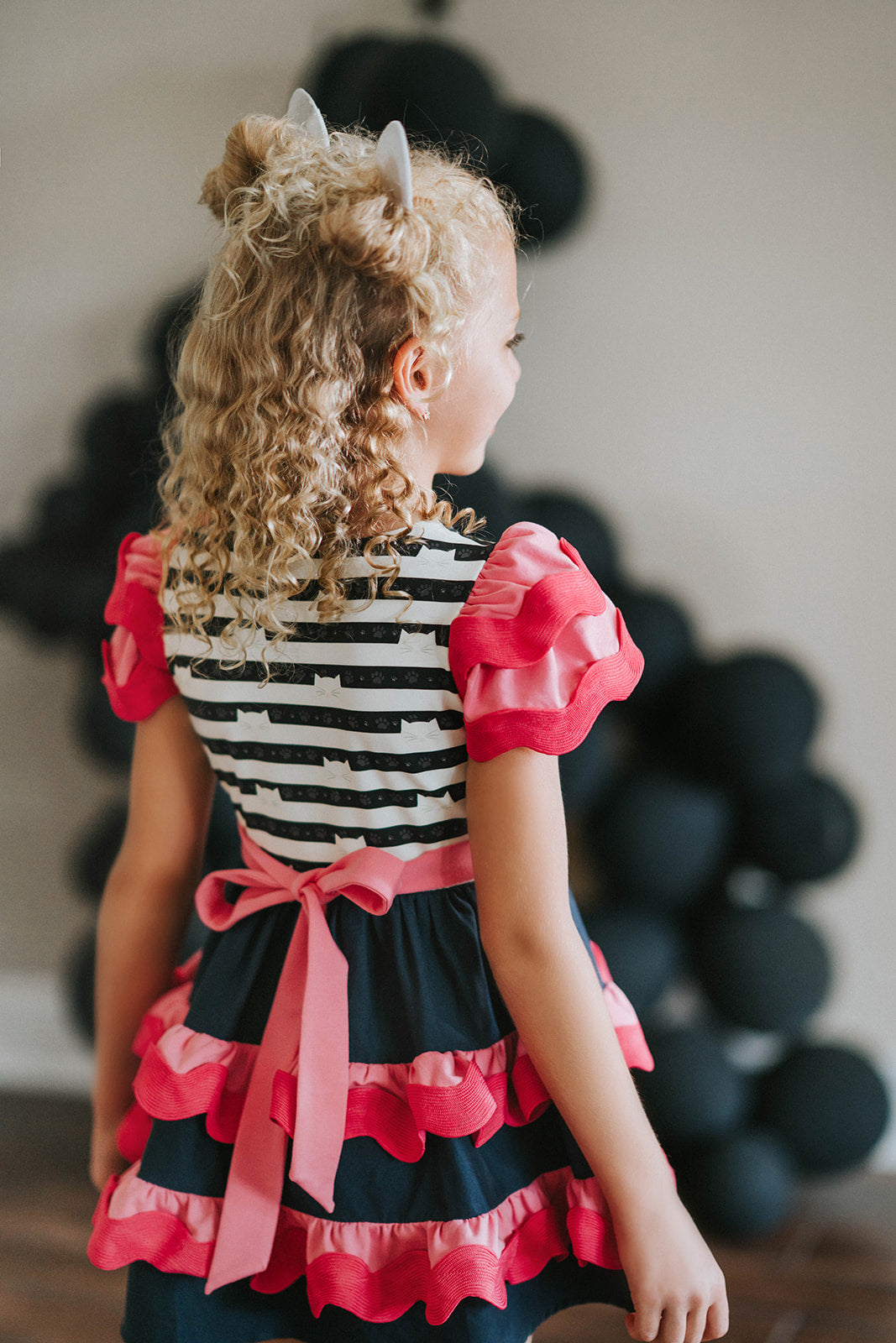 Bring the magic of our favorite dollhouse to life with this adorable Cat-tastic Dollhouse Adventure Dress — a whimsical mix of ruffles, color, and fun made for girls who love imagination, music, and magic. With bold pink and navy color blocking, layered ruffles, and a sweet kitty print bodice, this party dress is ideal for birthday celebrations, playdates, or any day that deserves a little meow-meow sparkle.