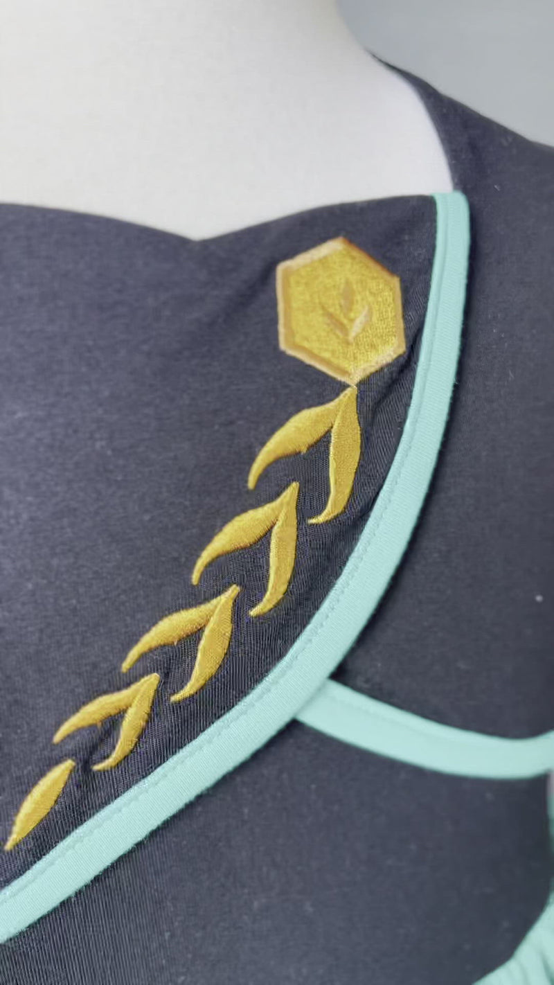 A stunning twirl dress with coordinating (reversible) cape. This dress includes all the details- embroidered designs, piping and embellishments along the skirt hem.