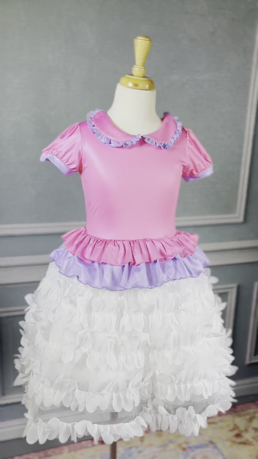 A unique dress with fancy details! This dress joins our character collection, with some updated and unique features! A shiny stretchy knit bodice provides a dressy look along with the ruffled Peter Pan collar and puff sleeves. The peplum waistline adds some glam factor, while the white floral fabric creates "fluff" to mimic the look of a feathery skirt.