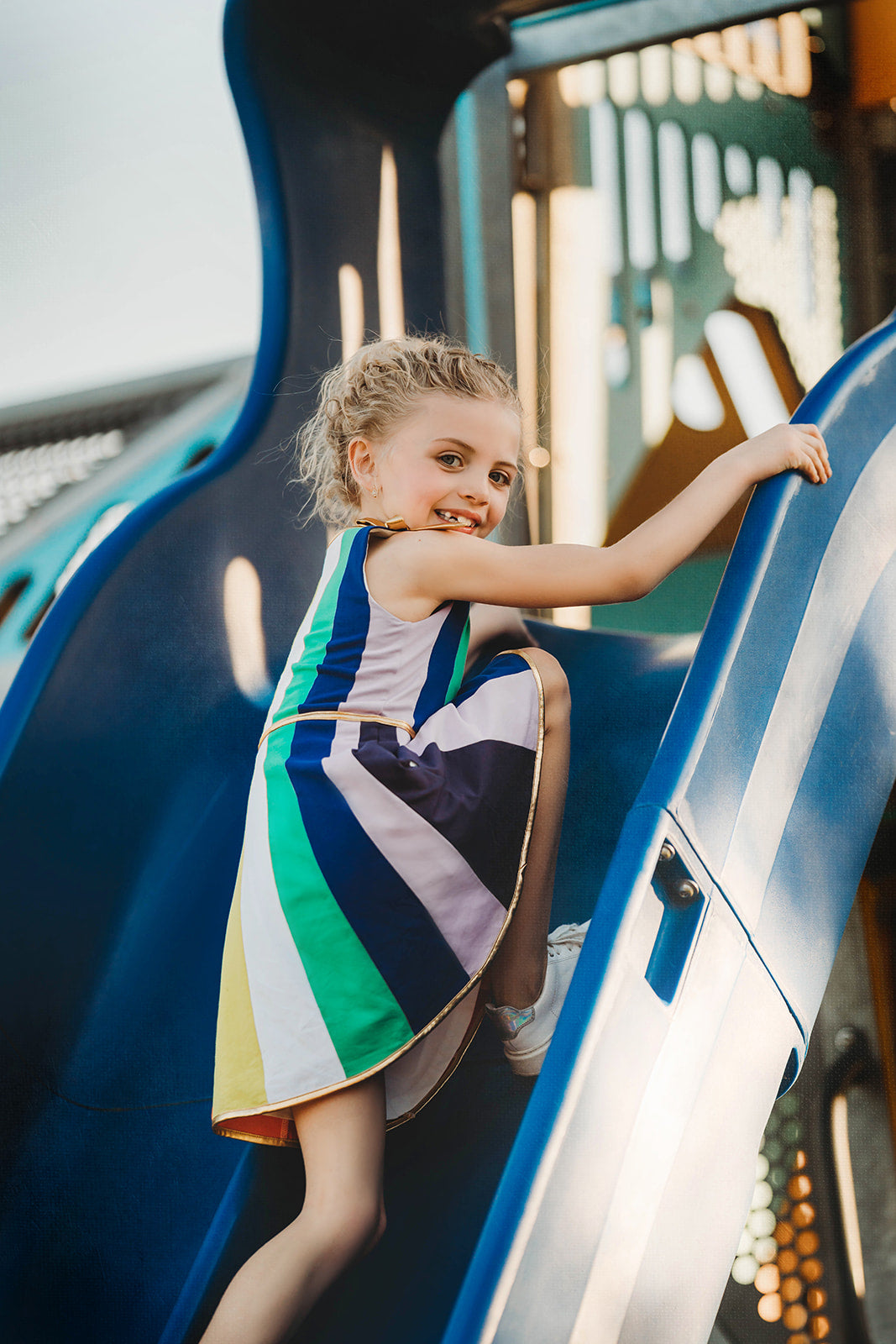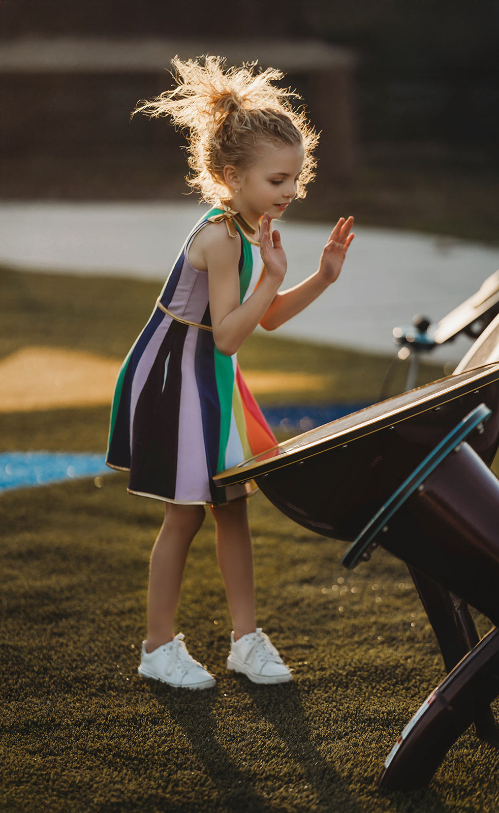 Brighten any day with the dash of sunshine in our Rainbow Beach Ball Dress! This cheerful A-line dress features bold vertical rainbow stripes in a vivid palette that captures the joy of childhood. Accented with golden piping at the hem and neckline, and finished with charming bow-tied shoulder straps, it’s as playful as it is stylish. Made from soft, breathable fabric, this dress is perfect for sunny park days, birthday parties, and every colorful adventure in between.