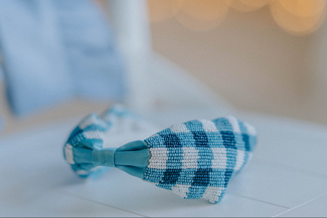 This Blue Gingham Beaded Headband blends nostalgic charm with sparkling detail. beaded in a crisp buffalo check pattern, it’s the perfect accessory for warm-weather styling — from spring portraits and summer picnics to birthday outfits and beach vacations.