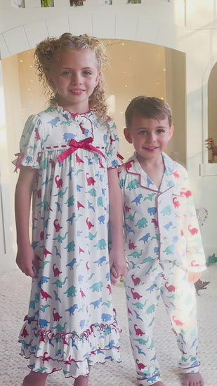 Make bedtime a prehistoric adventure with this adorable Girls Dinosaur Nightgown! Featuring a colorful allover dino print in red, blue, and green on soft white fabric, this nightgown blends playful charm with heirloom-inspired details like red satin bows, ruffled hems, and sweet lace trim.