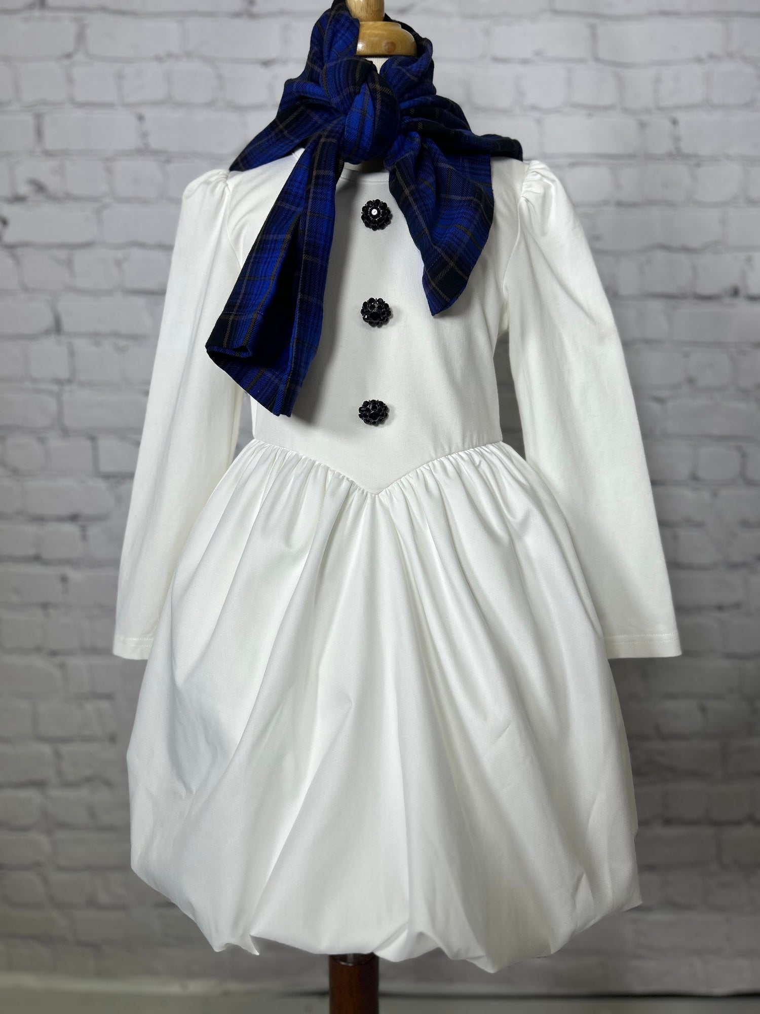 A special dress she will never forget- inspired by frosty, and crafted with cosy fabrics and trims , luxurious "coal" rhinestone buttons, and a wool plaid scarf.  Because you're creating a childhood, and we design clothes that create core memories.